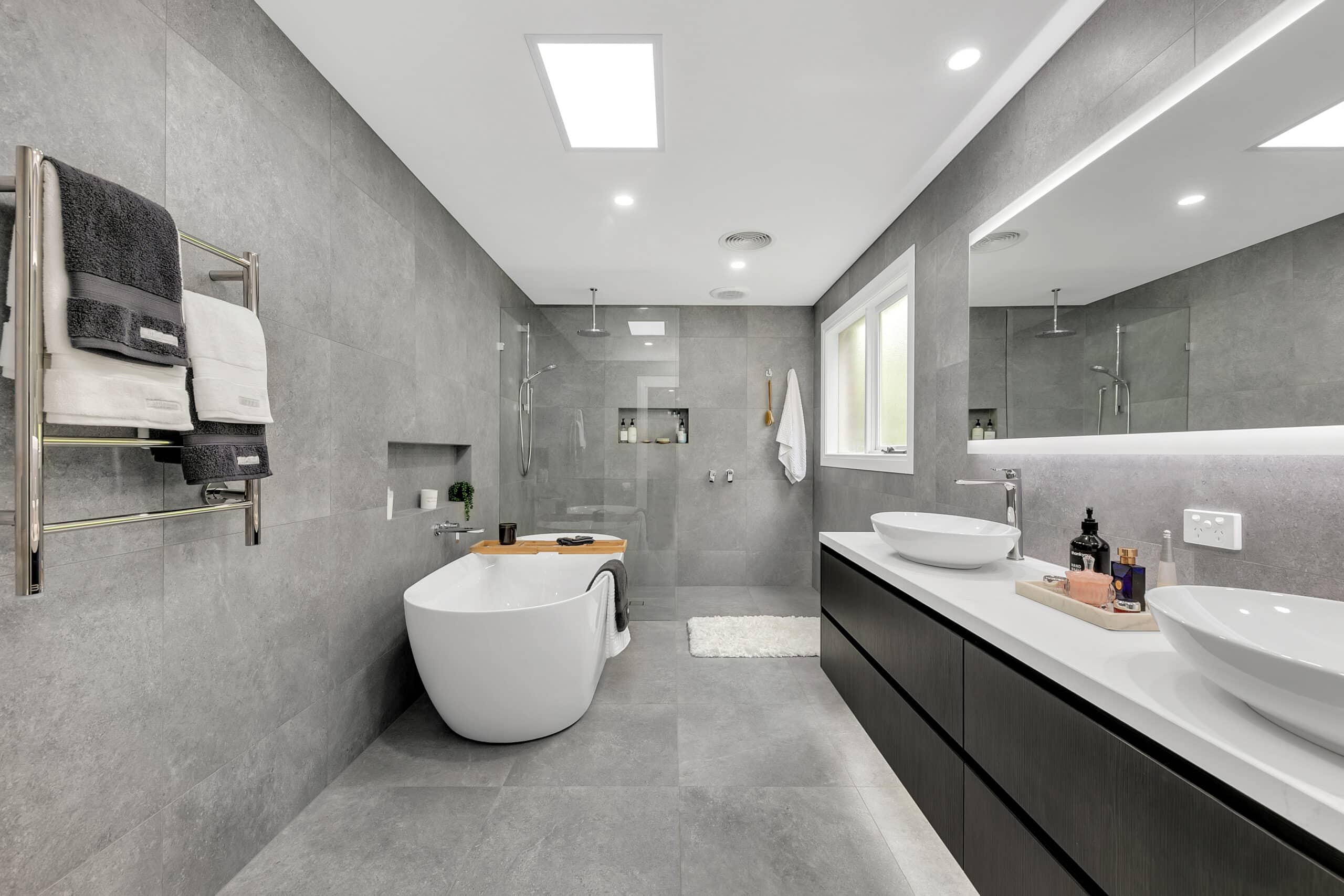 • Towel Rails: Position your towel rails within reaching distance of your wet area. That way when you step out of the shower you can reach for your towel, dry and walk out of the bathroom without getting your entire floor wet. It’s important to position your towels correctly, as it will allow you to keep your dry zone pristine and your bathroom looking beautiful.